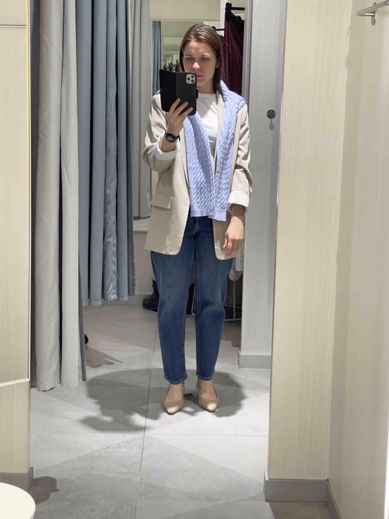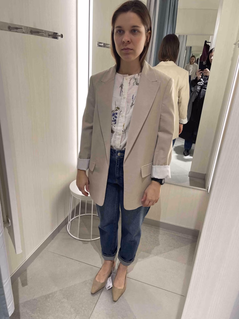 Järgmiseks läksin poodi – esmalt üksi, et tunnetada, mis mulle silma jääb. Saatsin stilistile pilte riietest, mis mulle meeldivad, ja sain kiiret tagasisidet. Seejärel tegime ka ühise poekülastuse, milleks seadsime selge eelarve, ajaraami ja sihi – leida asju, mis toetaksid mu eesmärki brändifotodel esinduslik ja loomulik välja näha.